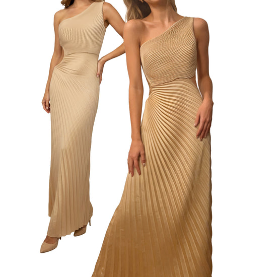 Ein Kleid aus Plisseestoff. Die Falten des Stoffs umschmeicheln die Figur und die Bewegungen der Trägerin und schaffen ein schönes Muster.