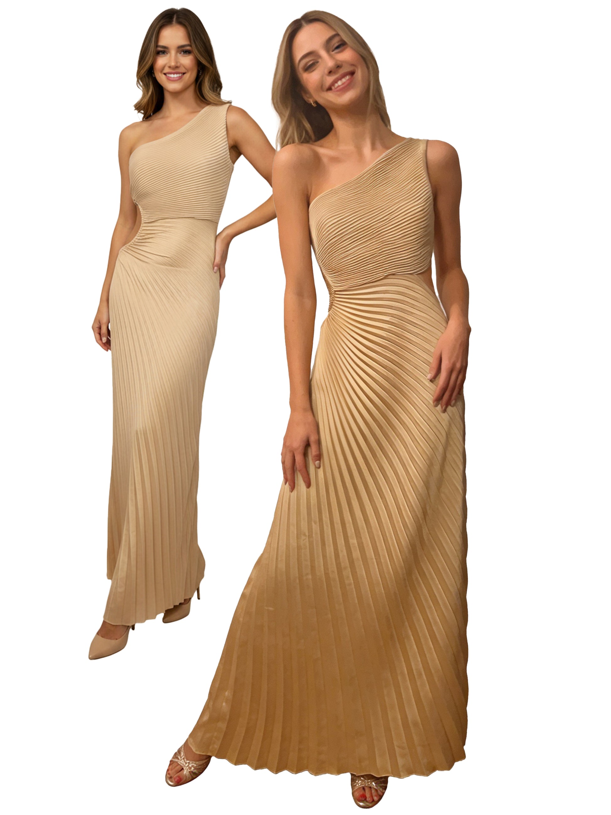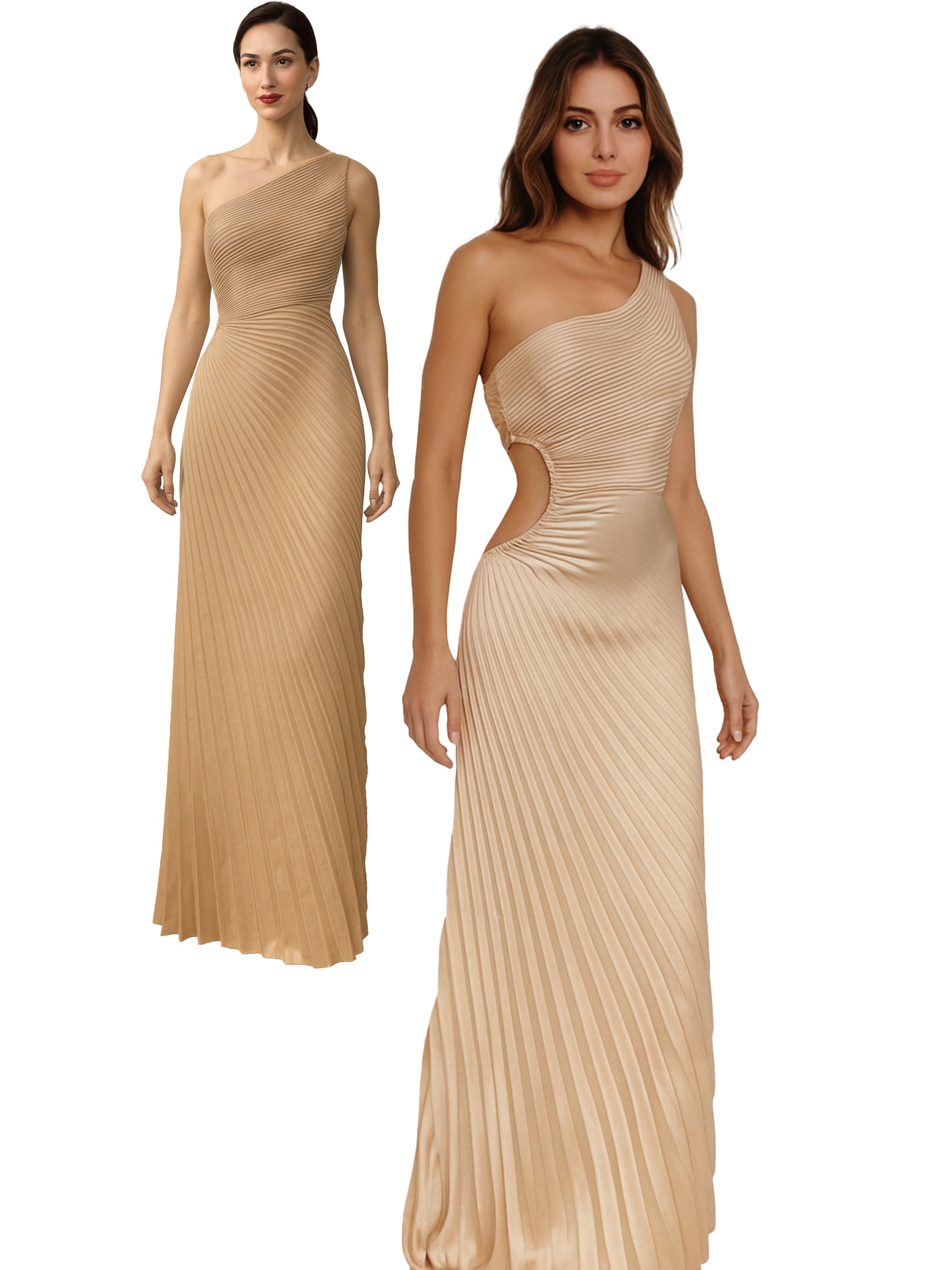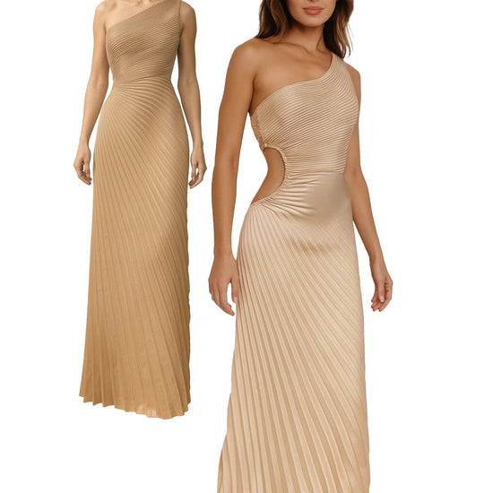 Durch das einarmige Design erhält das Kleid eine spannende Symmetrie. Diese wird durch die attraktive Aussparung auf Taillenhöhe unterstützt.